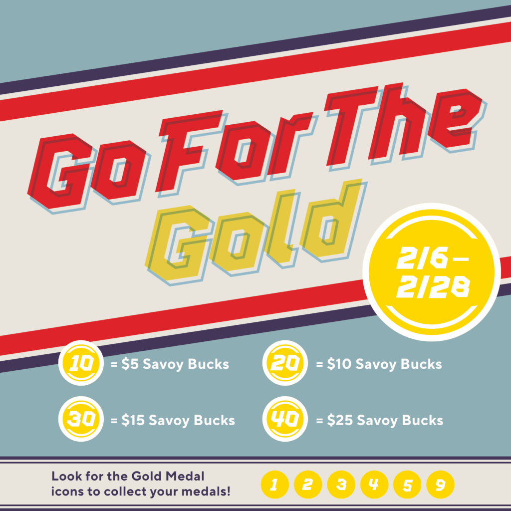 From February 6 through February 28, Thank You Rewards members can earn Gold Medals on select menu items. These medals live in a special Gold Medal Wallet, unlocking bonus Savoy Bucks on top of your regular rewards.